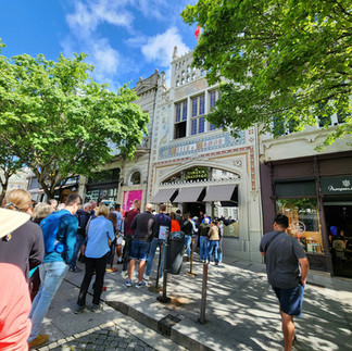 More photos from yesterday.Cynthia PiperApr 24, 20231 min readGroup busking. Similar to a group we saw in Coimbra.Street scenes- Jay' favourite place, a candy shop, the queue for the bookshop, and Jay with the invisible woman!